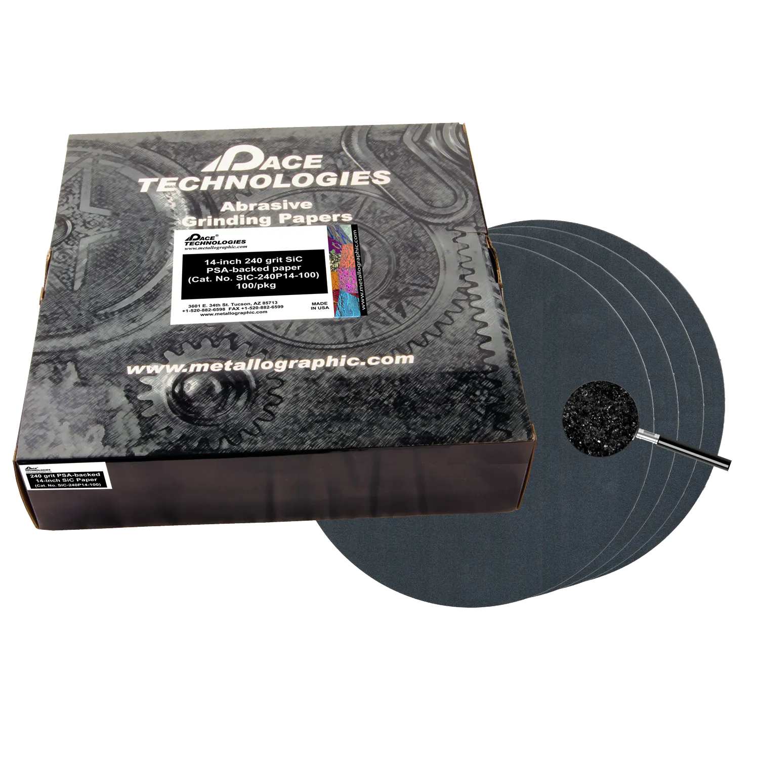 14-inch 240 grit SiC PSA (adhesive backed) Abrasive Grinding papers, available in 25, 50, and 100/box.