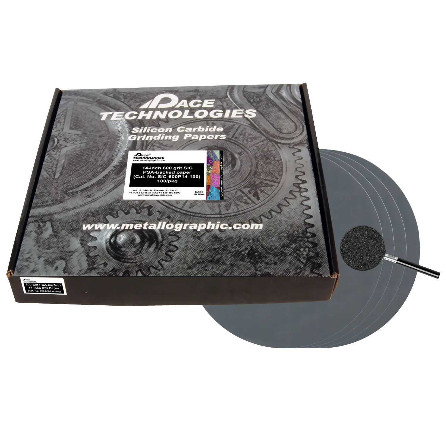 14-inch 600 grit SiC PSA (adhesive backed) Abrasive Grinding papers, available in 25, 50, and 100/box.