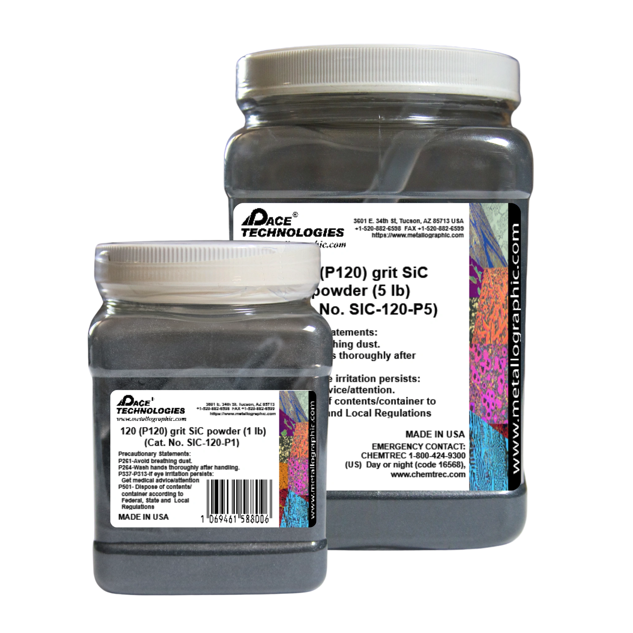 120 (P120) grit SiC Abrasive Grinding Powder, available in 1 lb and 5 lbs.